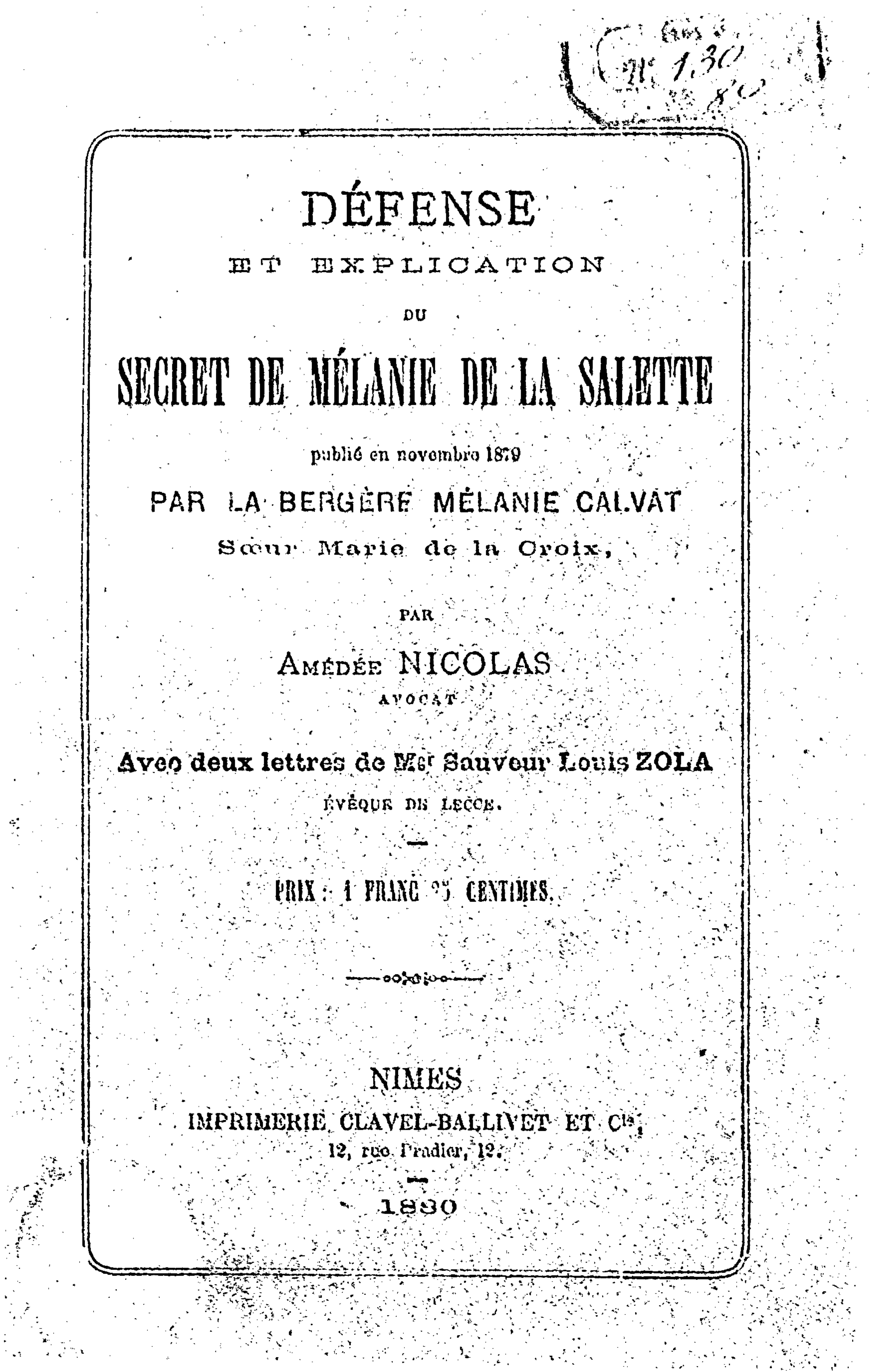 Défense et explication du Secret de la Salette publié en novembre 1879 par la bergère Mélanie Calvat Sœur Marie de la Croix, par Amédée Nicolas, avocat, avec deux lettres de Mgr Sauveur Louis Zola évêque de Lecce. Nimes 1880.