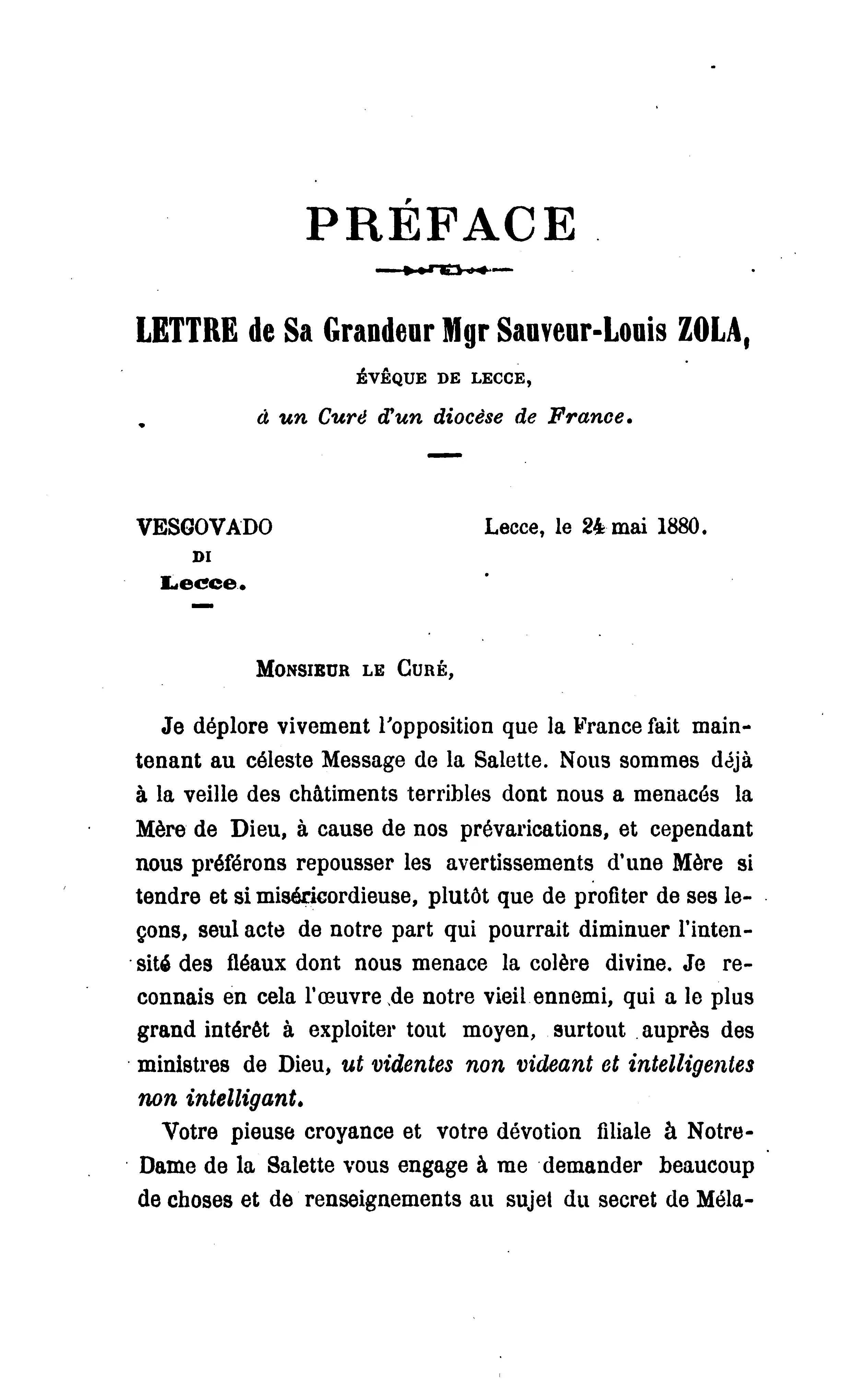 LETTRE de Sa Grandeur Mgr Sauveur-Louis ZOLA, ÉVÊQUE DE LECCE, a un Curé d’un diocèse de France. VESGOVADO Lecce, le 24 mai 1880.